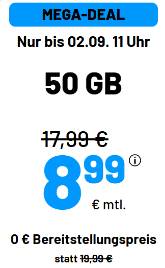 السعر والشروط: 8,99 € شهريًا، ورسوم تفعيل لمرة واحدة 29,99 €، مدة العقد 24 شهرًا، الإلغاء بشهر واحد قبل نهايته؛ يجدد تلقائيًا مع نفس مهلة الإلغاء.بعد انتهاء البيانات، تُضاف تلقائيًا حتى 3 مرات شهريًا 300 ميجابايت مقابل 2 € لكل مرة—قابلة للتعطيل. (handyvertrag.de, sim.de)