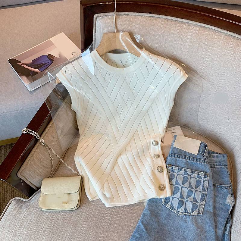 تي شيرت نسائي فرنسي عالي الجودة بدون أكمام مصنوع من حرير الثلج الأبيض قصير الأكمام 2023 ربيع وصيف جديد بتصميم ضيق