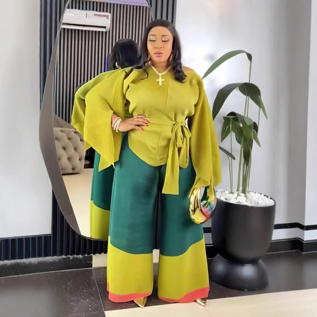 مجموعة ملابس نسائية - بلوزة مطوية ثلاثية + بنطلون واسع مستقيم